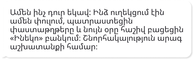 Ինձ օգնություն էր հարկավոր ընկերությունը գրանցելու և բանկային հաշիվ բացելու հարցում։ Դիմեցի ընկերներիս առաջարկով: Ընկերություն է, որին կարելի է վստահել: Մասնագիտական խորհրդատվություն, իրավաբանական աջակցություն, ժամկետների պահպանում, 2 օրվա ընթացքում կարելի է լուծել մի շարք հարցեր, որոնց համար սովորաբար մեկ շաբաթ է պետք: Հաշիվների հետ հիմա ամենուր է դժվար, բայց ամեն ինչ օպերատիվ լուծում են: