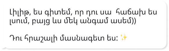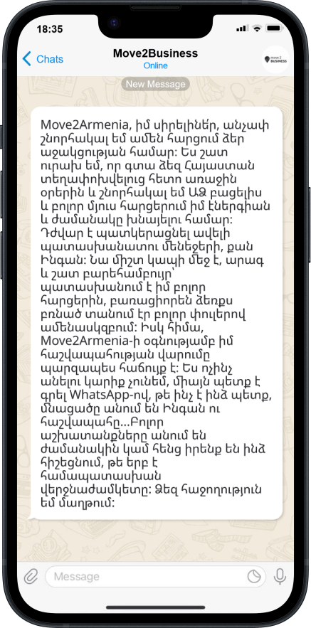 Ես դիմեցի Move2Armenia Business-ի աջակցությանը և չփոշմանեցի. ամեն ինչ բարձրորակ և արագ էր: Նրանց օգնությամբ բացեցի Ա/Ձ, բանկային հաշիվներ և արդեն ստացել եմ ՏՏ սերտիֆիկատ։ Բացի այդ, նրանք հոգ են տանում իմ հաշվապահության մասին, ինչն ինձ իսկապես ազատեց գլխացավից) Հատուկ շնորհակալություն Ինգային․ նա միշտ կօգնի խորհրդով և աշխատանքով: Խորհուրդ եմ տալիս ծառայությունը)